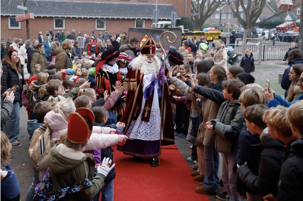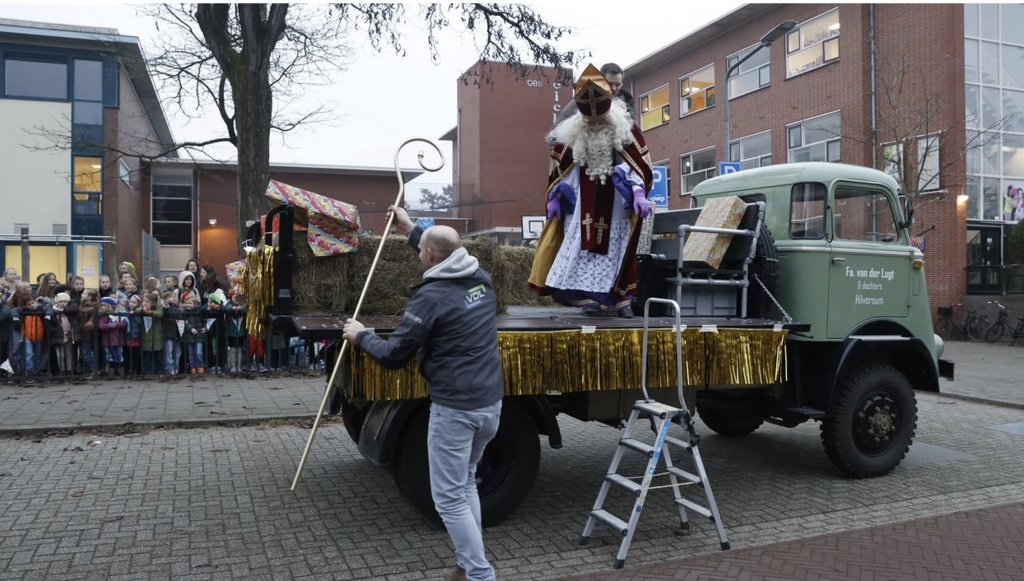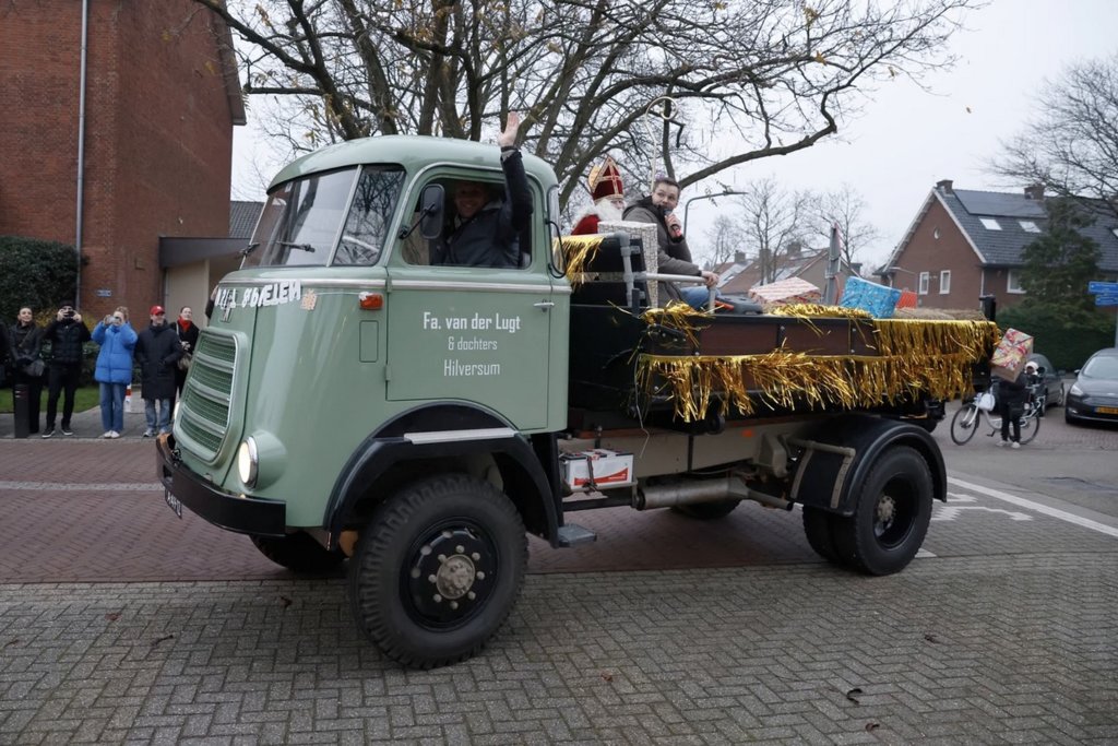 Het is even schrikken voor de 180 leerlingen die achter het hek geduldig staan de wachten. Een oude brandweerwagen met pakjes in de laadbak rijdt voorbij, maar Sinterklaas is nergens te bekennen. Wanneer de antieke vrachtwagen na een extra rondje om de school arriveert blijkt Sinterklaas met drie pieten wél aan boord. Gejoel stijgt op.